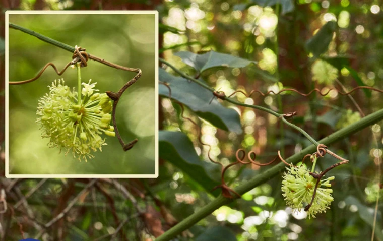 Prickly vine, climbing by tendrils. 5mm white flowers in clusters all year. Lightly fragrant. Fruit globose, black, to 8mm.
