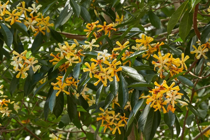 Shrub, semi-deciduous to 2m. Leaves opposite, hairless to 9cm. Milky sap. White 5-petalled perfumed flowers to 25mm. Banana shaped yellow fruit to 4.5cm, often in pairs, opens to show red seeds POISONOUS. Flowering spring to summer. Fruiting around February.
